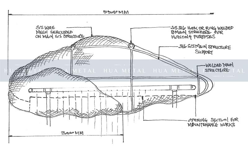 Com o desenvolvimento contínuo da arte pública, o aço inoxidável é cada vez mais utilizado na produção de esculturas. Além dos painéis de aço inoxidável com diferentes efeitos de superfície, os painéis perfurados de aço inoxidável estão se tornando cada vez mais amplamente utilizados. Essa escultura do Cloud Nine, também chamada de chuva, é uma obra de arte contemporânea que parece estar flutuando acima da gravidade que desafia a água, assim como Cingapura superou seus desafios ao longo dos anos. O título parece um oxímoro referenciando a sensação de júbilo de estar em Cloud Nine e uma previsão sinistra de chuva. Ao mesmo tempo, as chuvas aqui simbolizam o impulso de Cingapura em direção ao auto-sustento dos recursos hídricos e à constante renovação automática. Assim como a fonte de ferro fundido vitoriana Tan Kim Seng, nas proximidades, celebra o desenvolvimento de água encanada para a área da cidade, esta escultura em nuvem 'chovendo' é uma celebração visual do progresso de Cingapura em direção a um futuro mais seguro através da auto-suficiência hídrica. É altura do suporte 7 metros em aço inoxidável perfurado 316L com pintura no interior e aço inoxidável 304 na estrutura interior.
